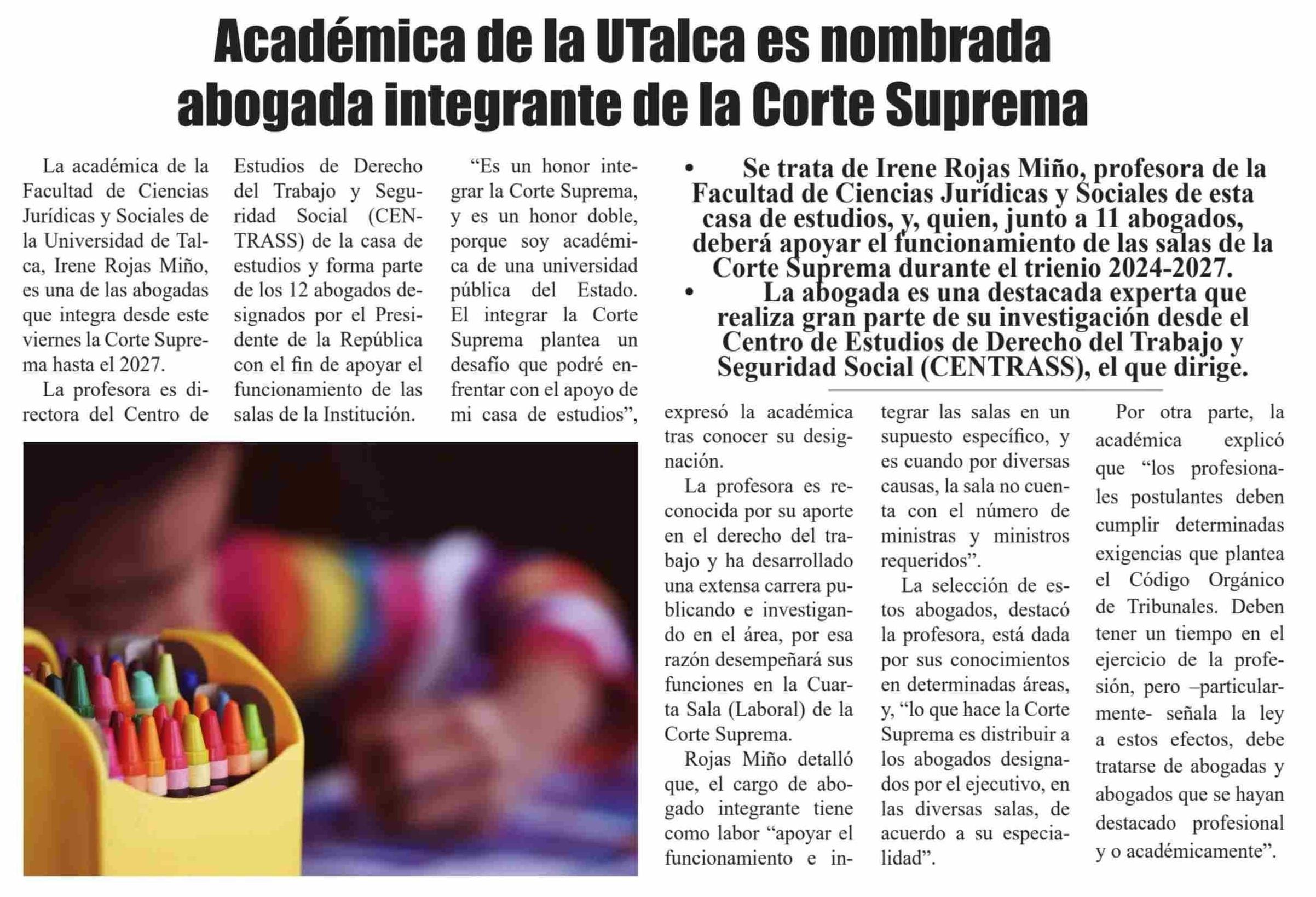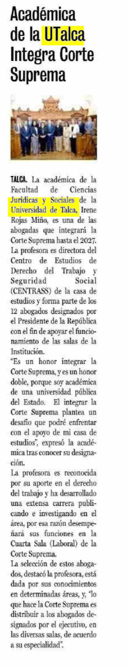 Académica de la UTalca Integra Corte Suprema. Se refiere, Irene Rojas Miño académica de la Facultad de Ciencias Jurídicas y Sociales.