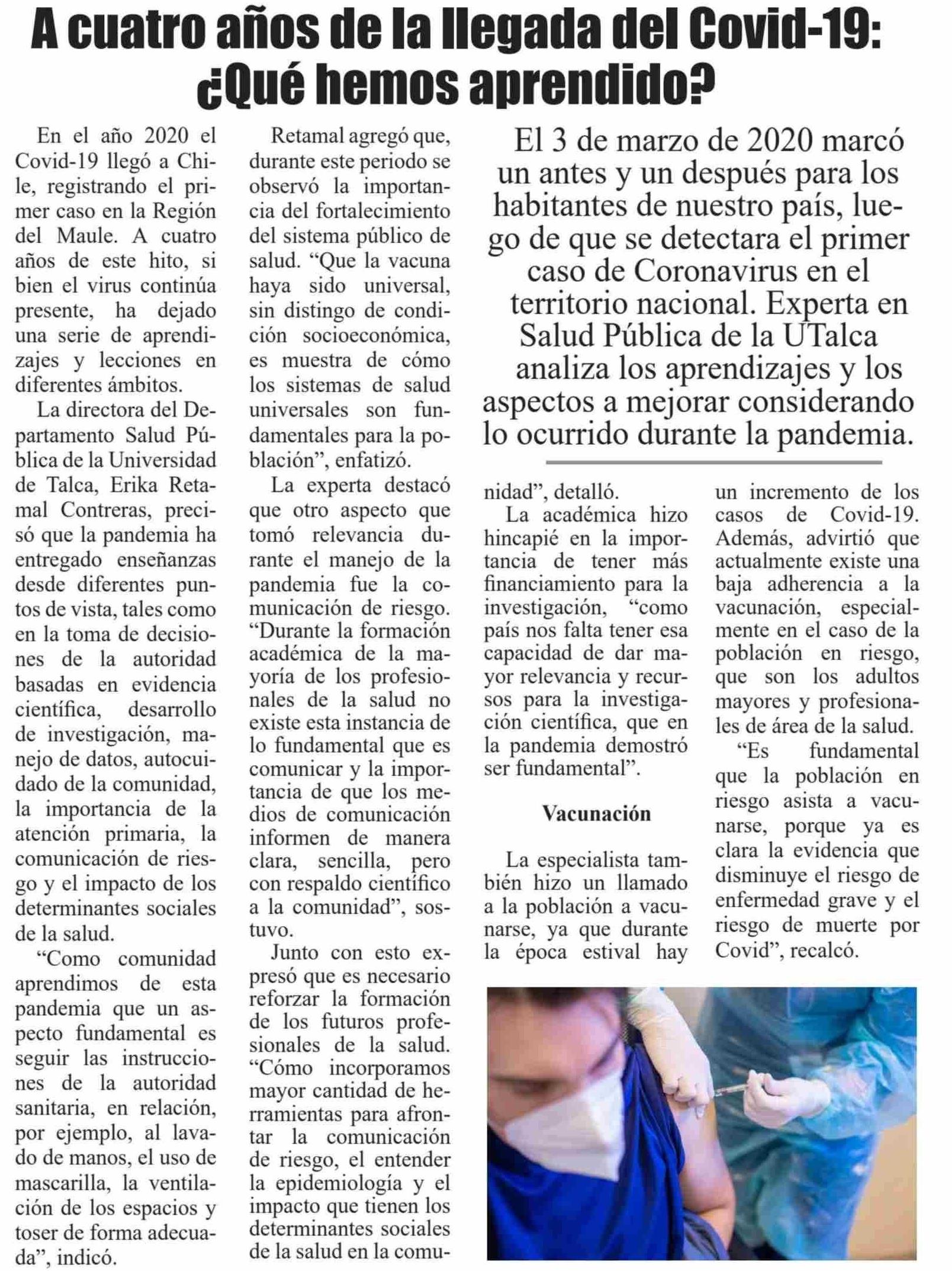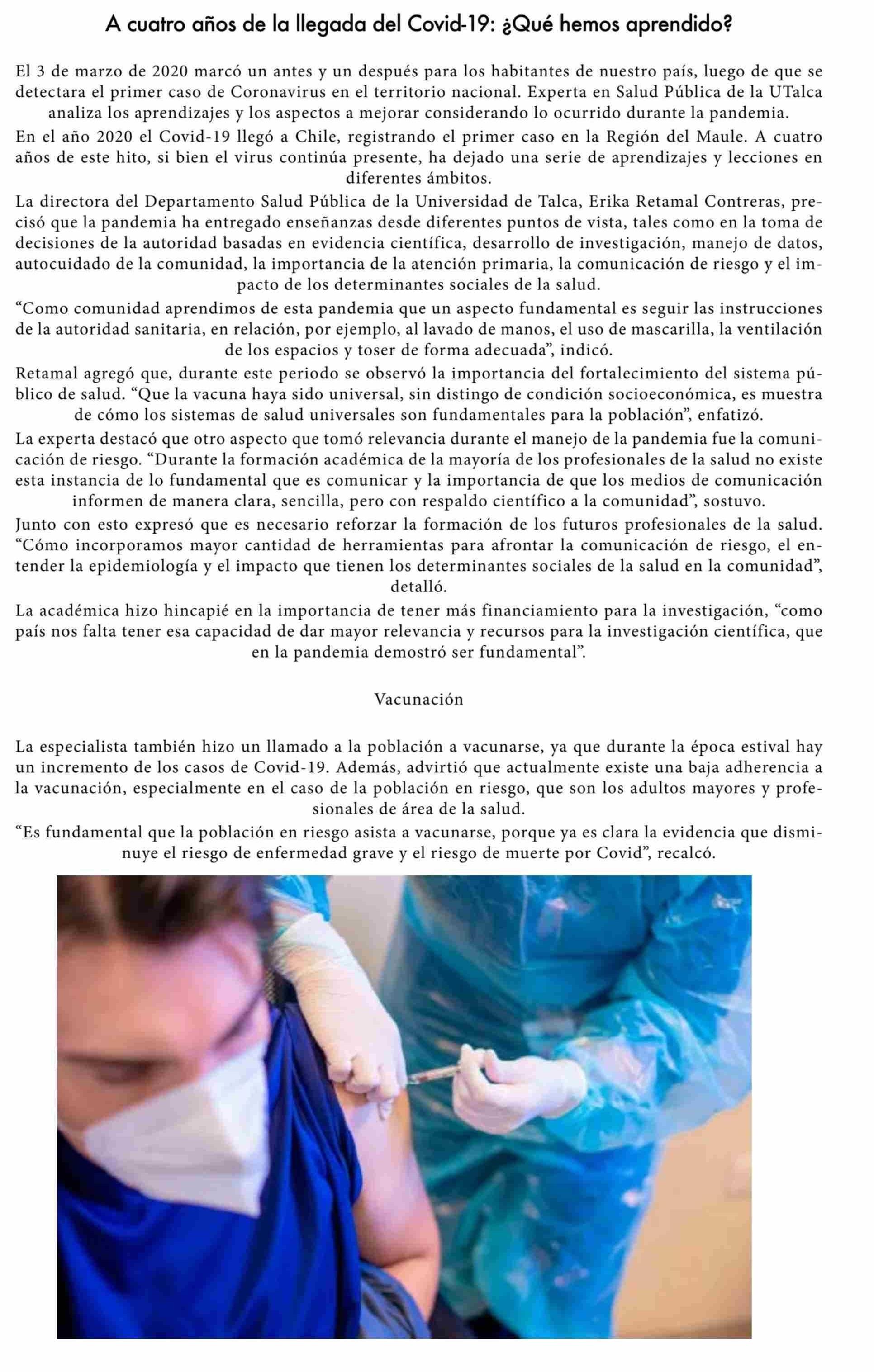 A cuatro años de la llegada del Covid-19: ¿Qué hemos aprendido? Se refiere Érika Retamal Contreras, directora del Departamento de Salud Pública.