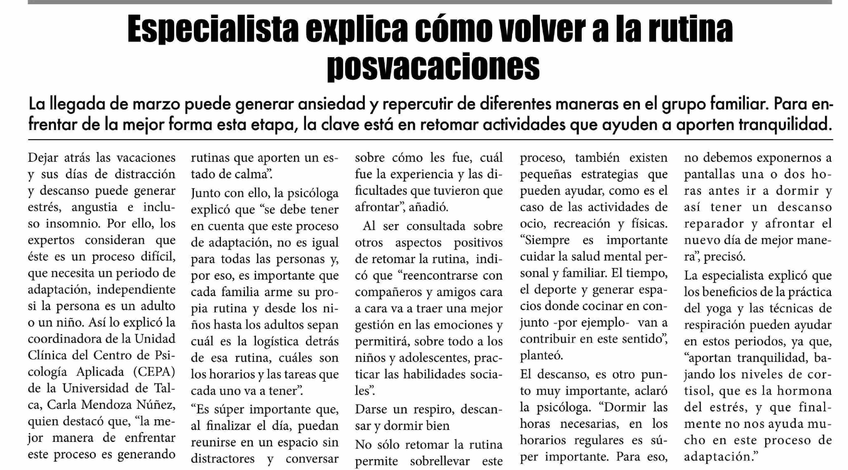 Especialista explica cómo volver a la rutina posvacaciones. Se refiere Carla Mendoza Núñez, coordinadora de la Unidad Clínica del Centro de Psicología Aplicada (CEPA)