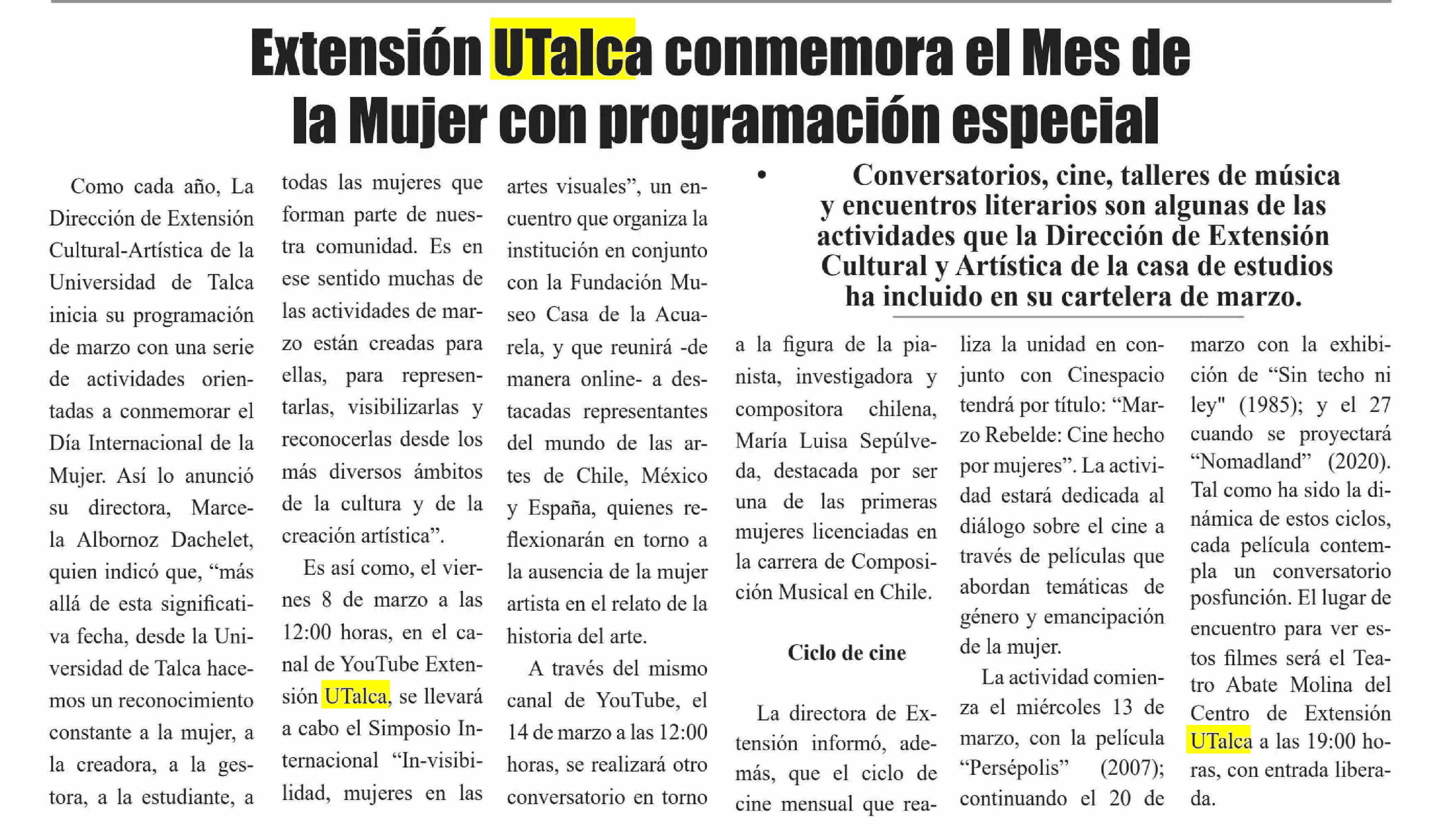 Extensión UTalca conmemora el Mes de la Mujer con programación especial. Se refiere Marcela Albornoz Dachelet, directora de Extensión Artística-Cultural y Editorial.