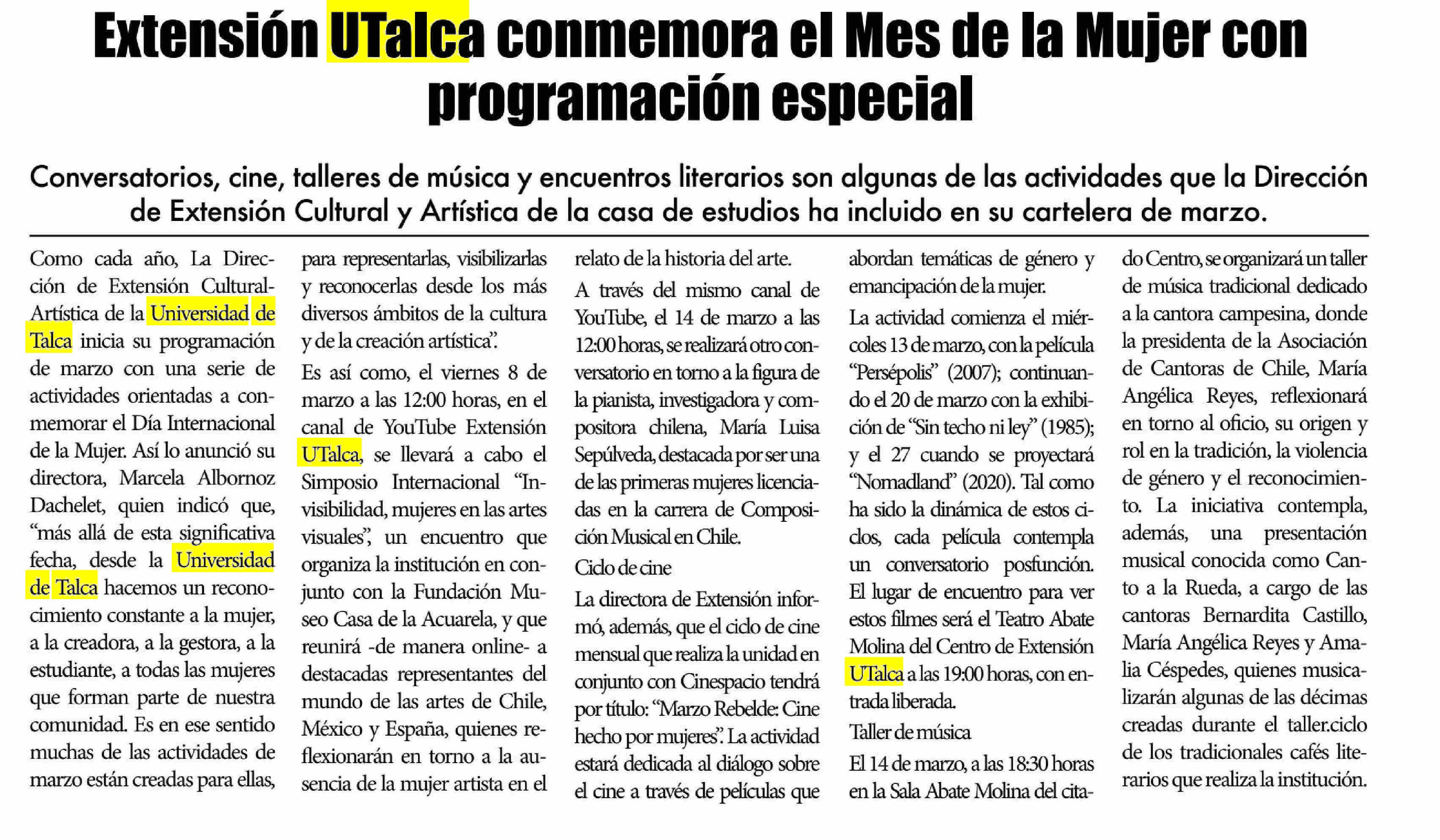 Con especial programación UTalca conmemora Mes de la Mujer. Se refiere Marcela Albornoz Dachelet, directora de Extensión Artística-Cultural y Editorial.