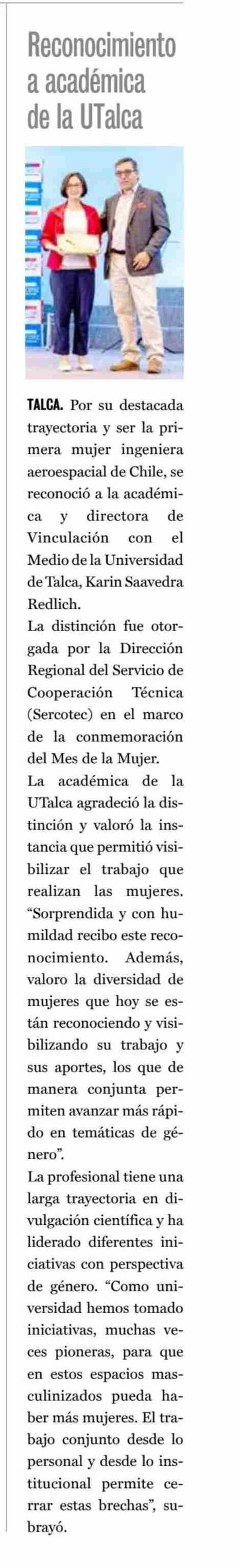 Destacan a académica de la Universidad de Talca por su contribución a la equidad de género. Se refiere Karin Saavedra Redlich, directora de Vinculación con el Medio y Marcela Barros Morales, directora de Comunicaciones Corporativas