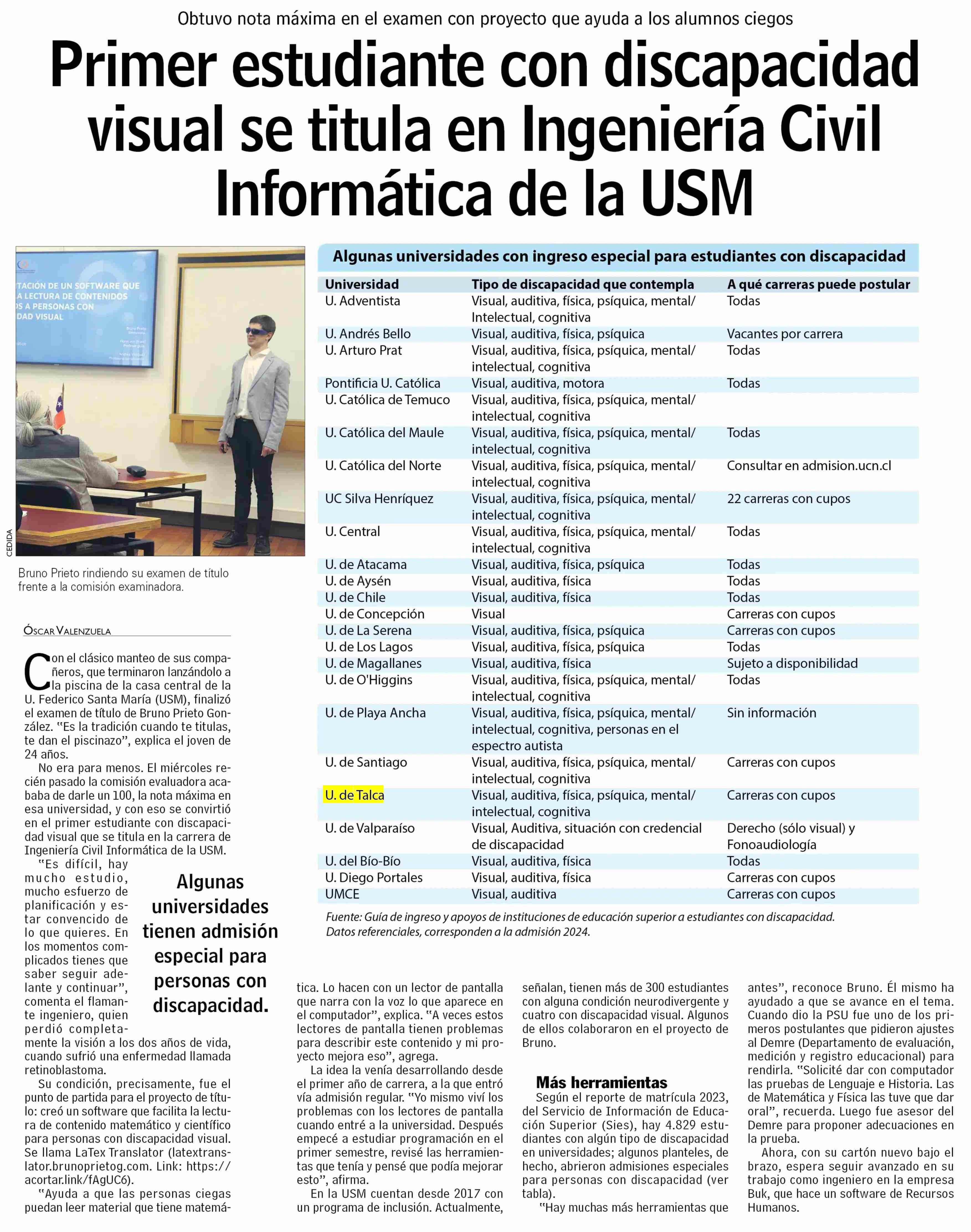Primer estudiante con discapacidad visual se titula en Ingeniería Civil Informática de la USM. Se menciona la Universidad de Talca.