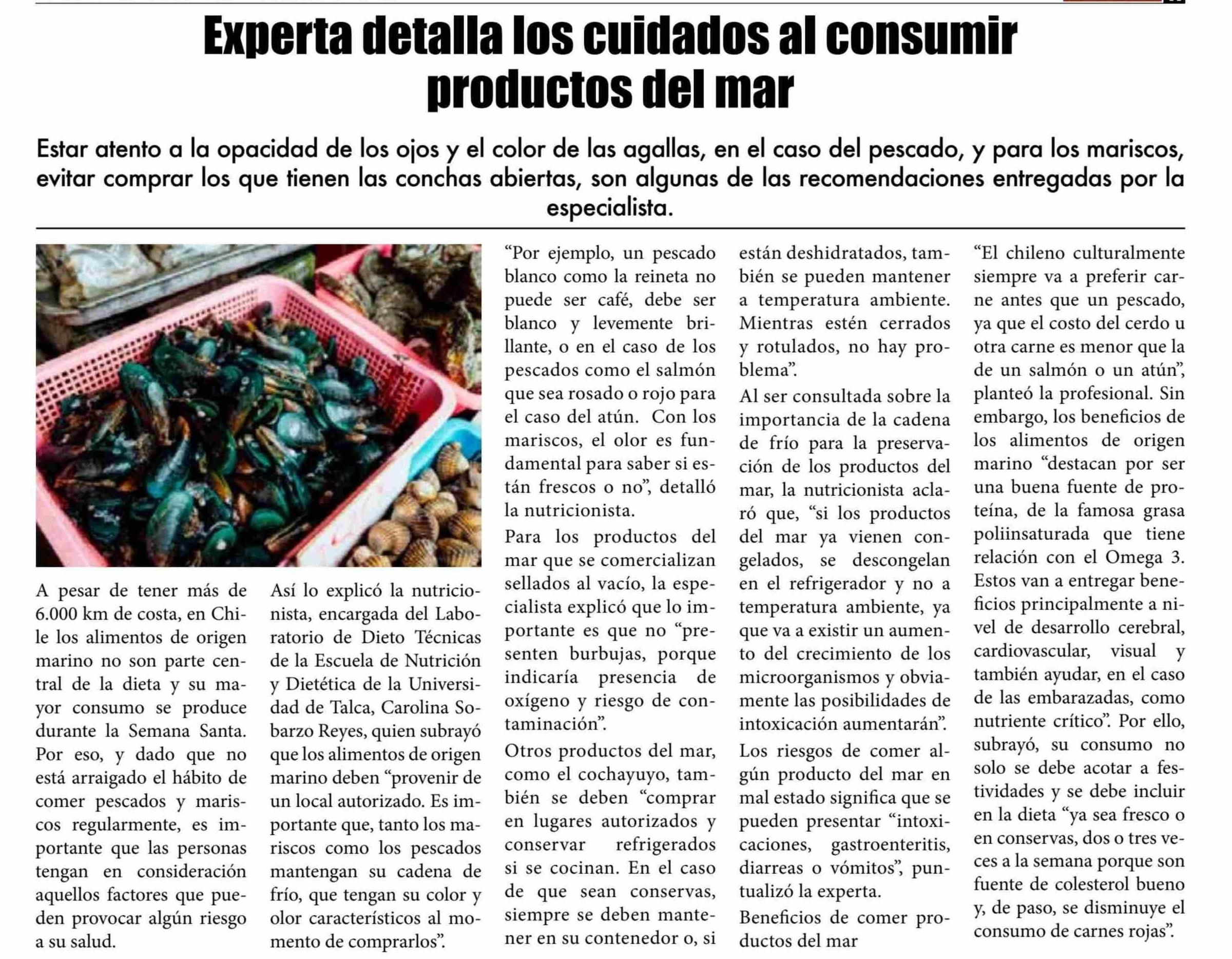 Experta detalla los cuidados al consumir productos del mar. Se refiere Carolina Sobarzo Reyes, nutricionista encargada del Laboratorio de Dieto Técnicas de la Escuela de Nutrición.