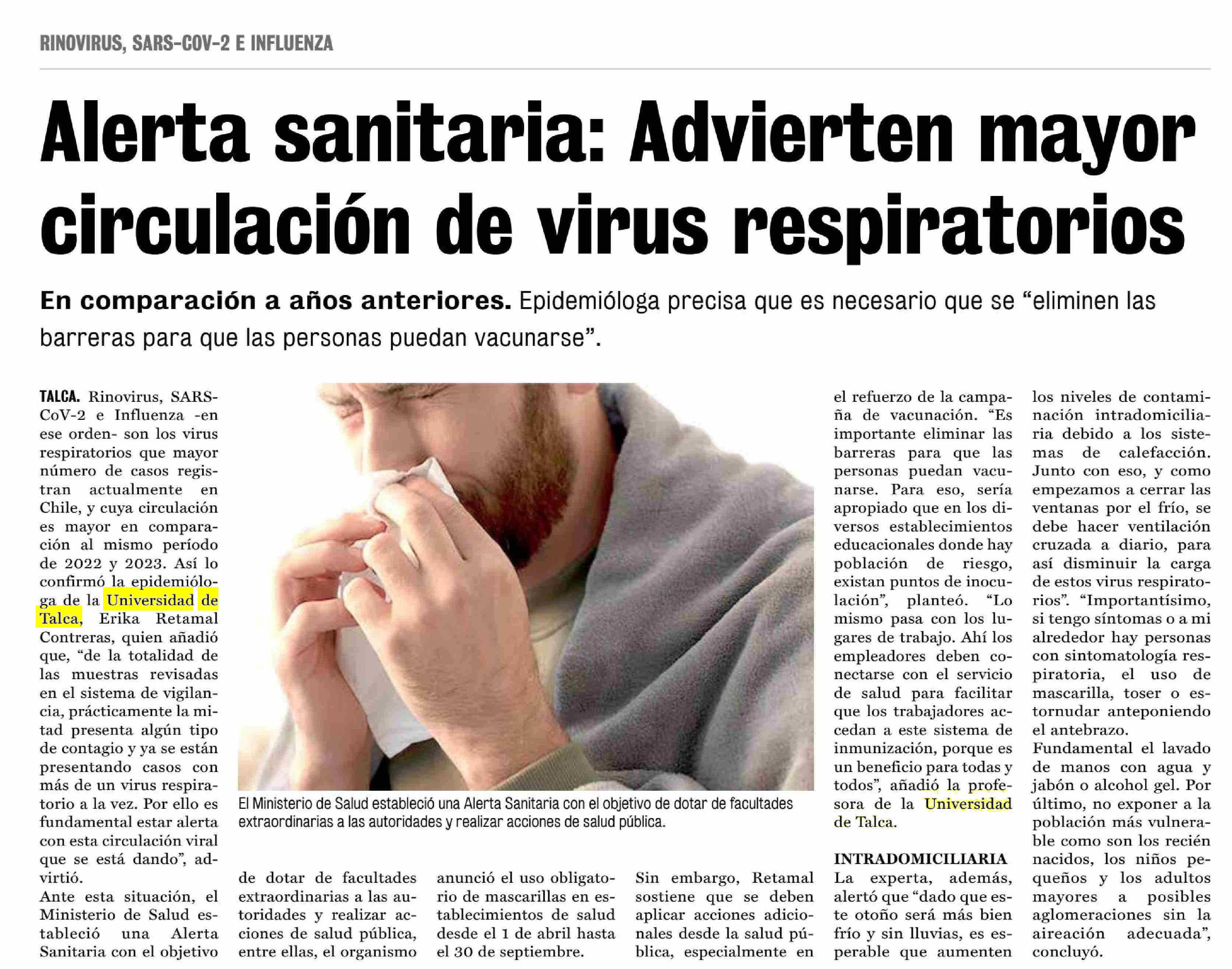 Alerta sanitaria: Advierten mayor circulación de virus respiratorios. Se refiere Érika Retamal Contreras, epidemióloga y directora del Departamento de Salud Pública.