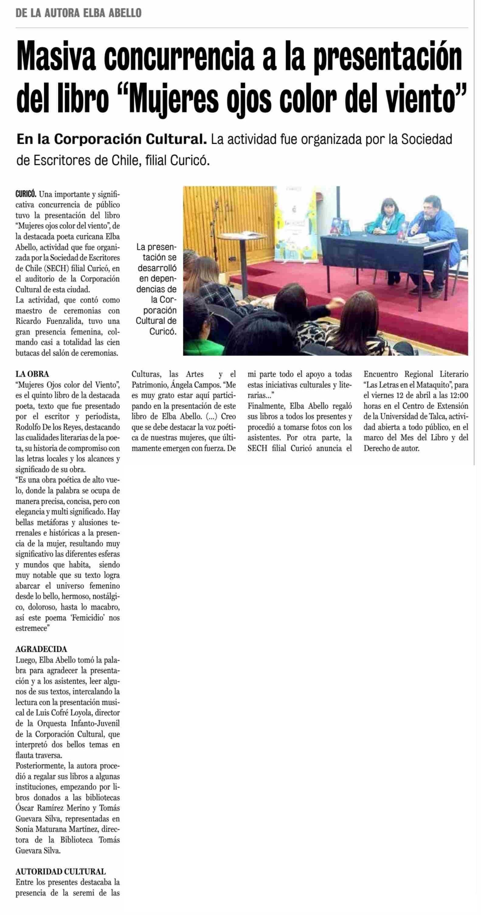 Masiva concurrencia a la presentación del libro “Mujeres ojos color del viento”. Se menciona la Universidad de Talca.