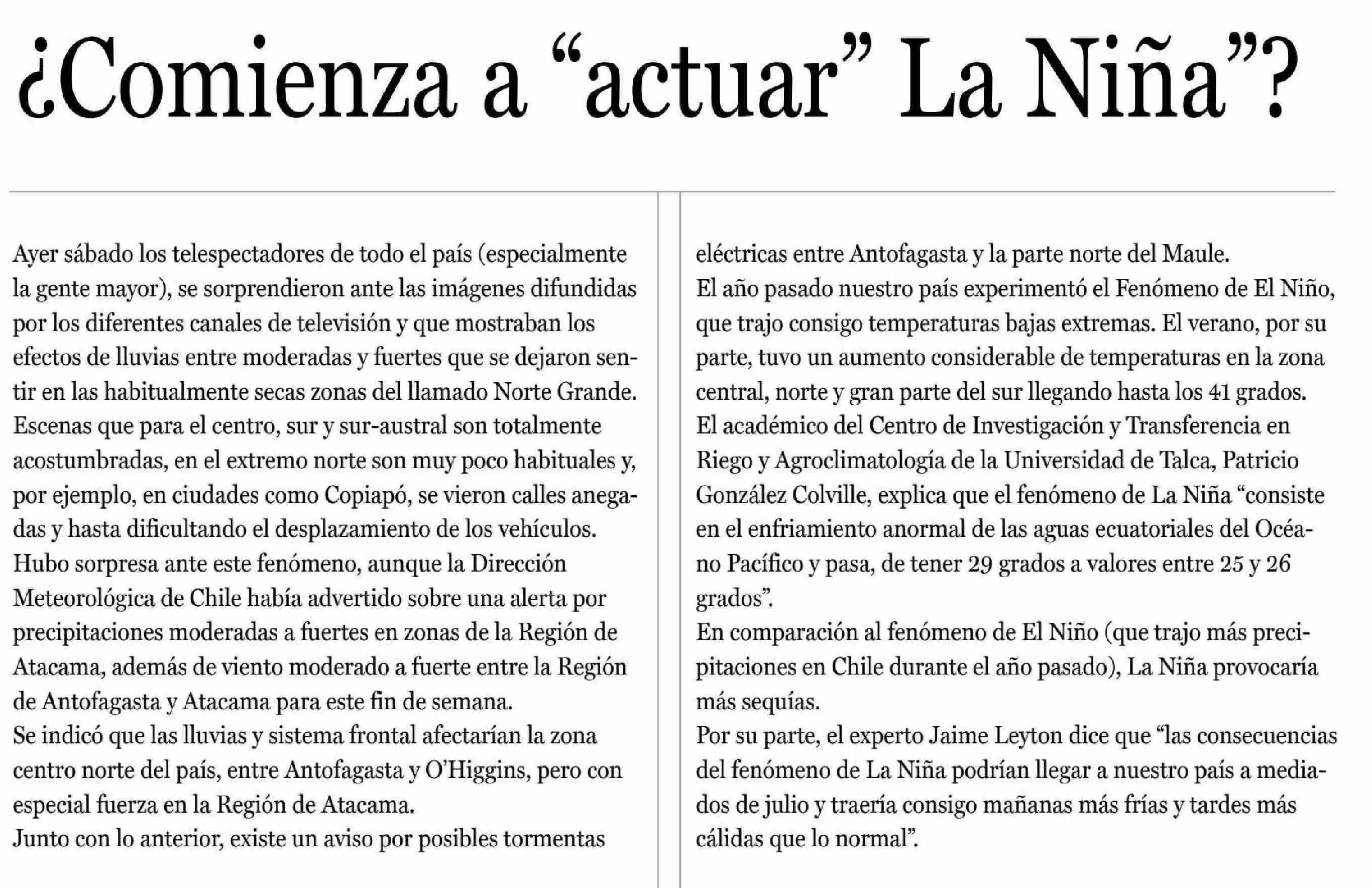 ¿Comienza a “actuar” La Niña”? Se refiere atricio González Colville, agroclimatólogo y académico del Centro de Investigación y Transferencia en Riego y Agroclimatología (CITRA).