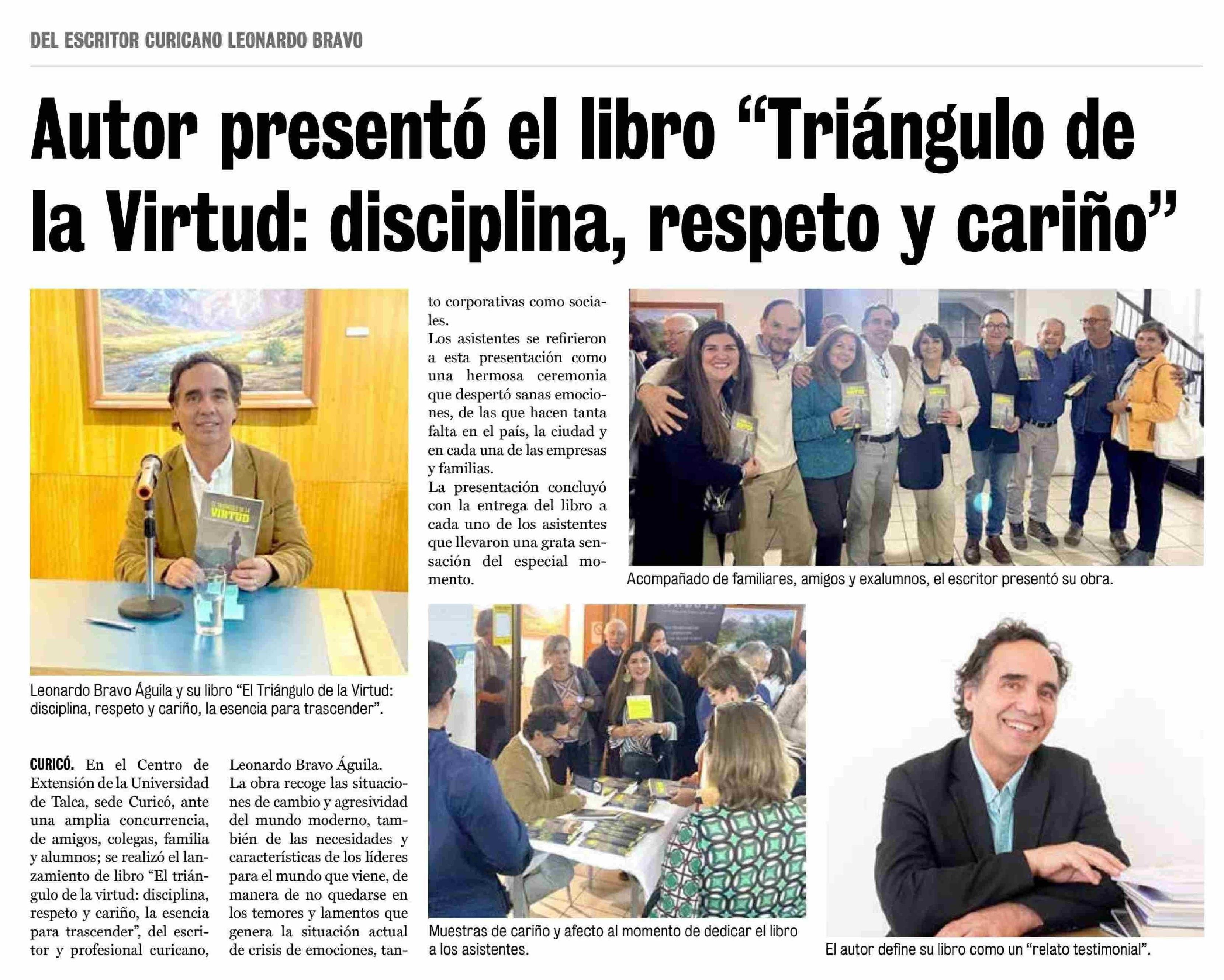 Autor presentó el libro “Triángulo de la Virtud: disciplina, respeto y cariño”. Se menciona la Universidad de Talca.