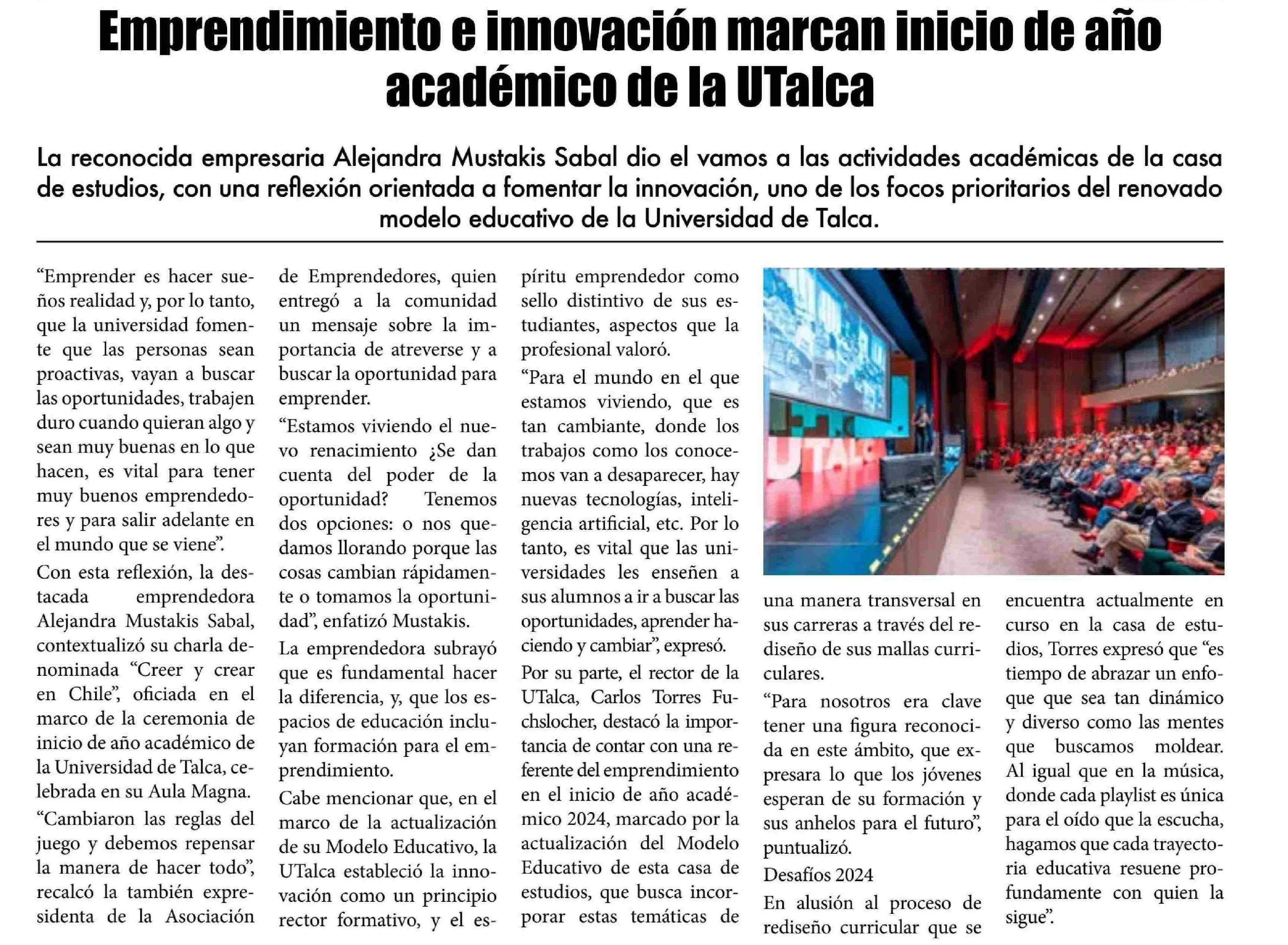 Emprendimiento e innovación marcan inicio de año académico de la UTalca. Se refiere Carlos Torres Fuchslocher, rector.