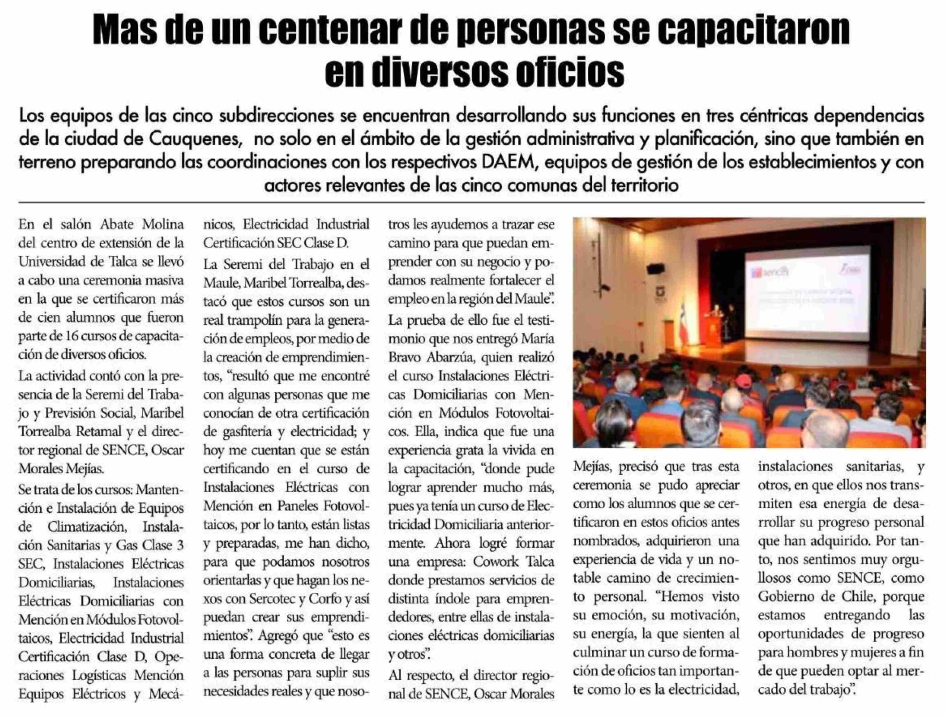Más de un centenar de personas se capacitaron en diversos oficios. Se menciona la Universidad de Talca. Se menciona la Universidad de Talca.