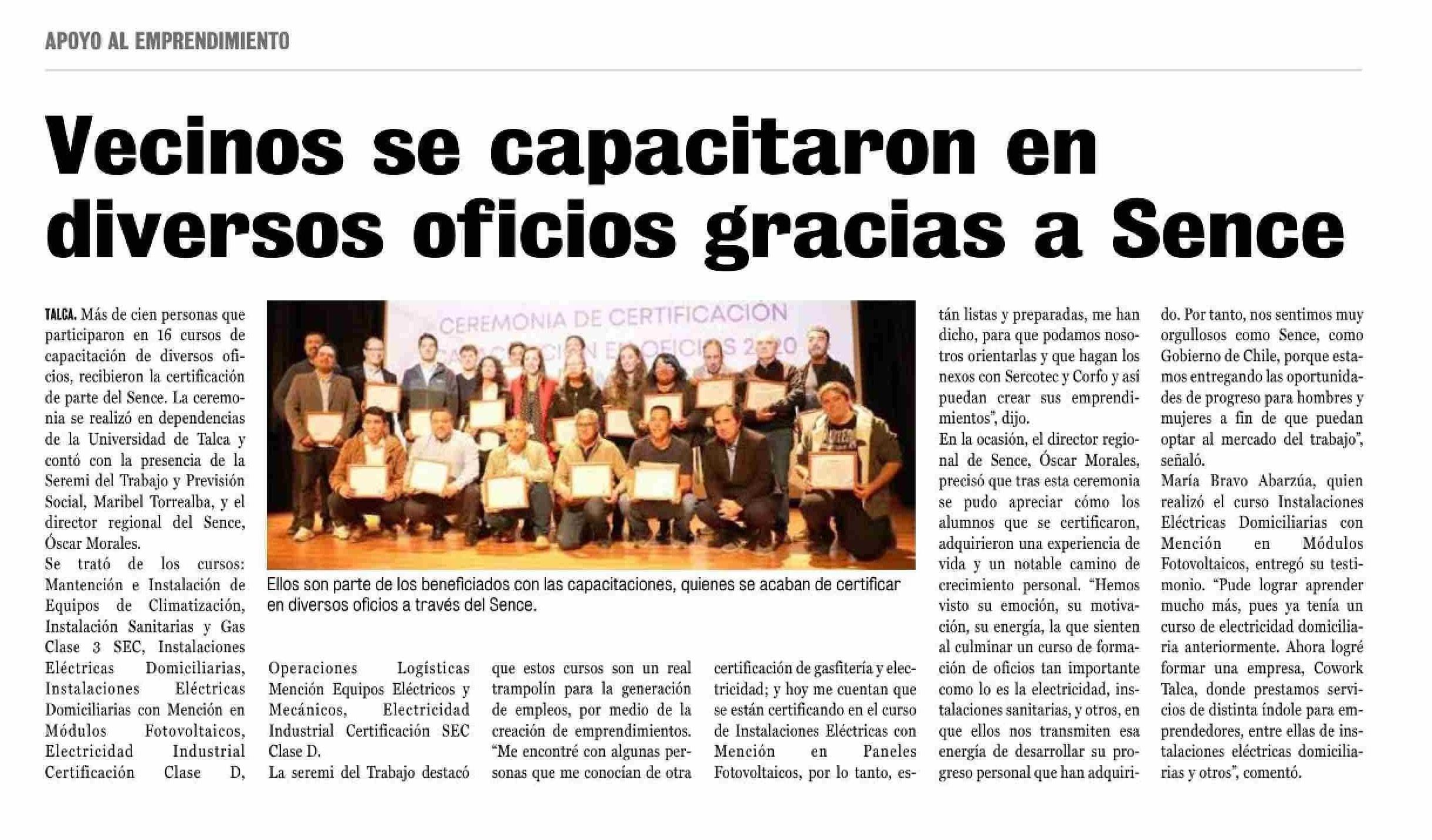 Vecinos se capacitaron en diversos oficios gracias a Sence. Se menciona la Universidad de Talca.