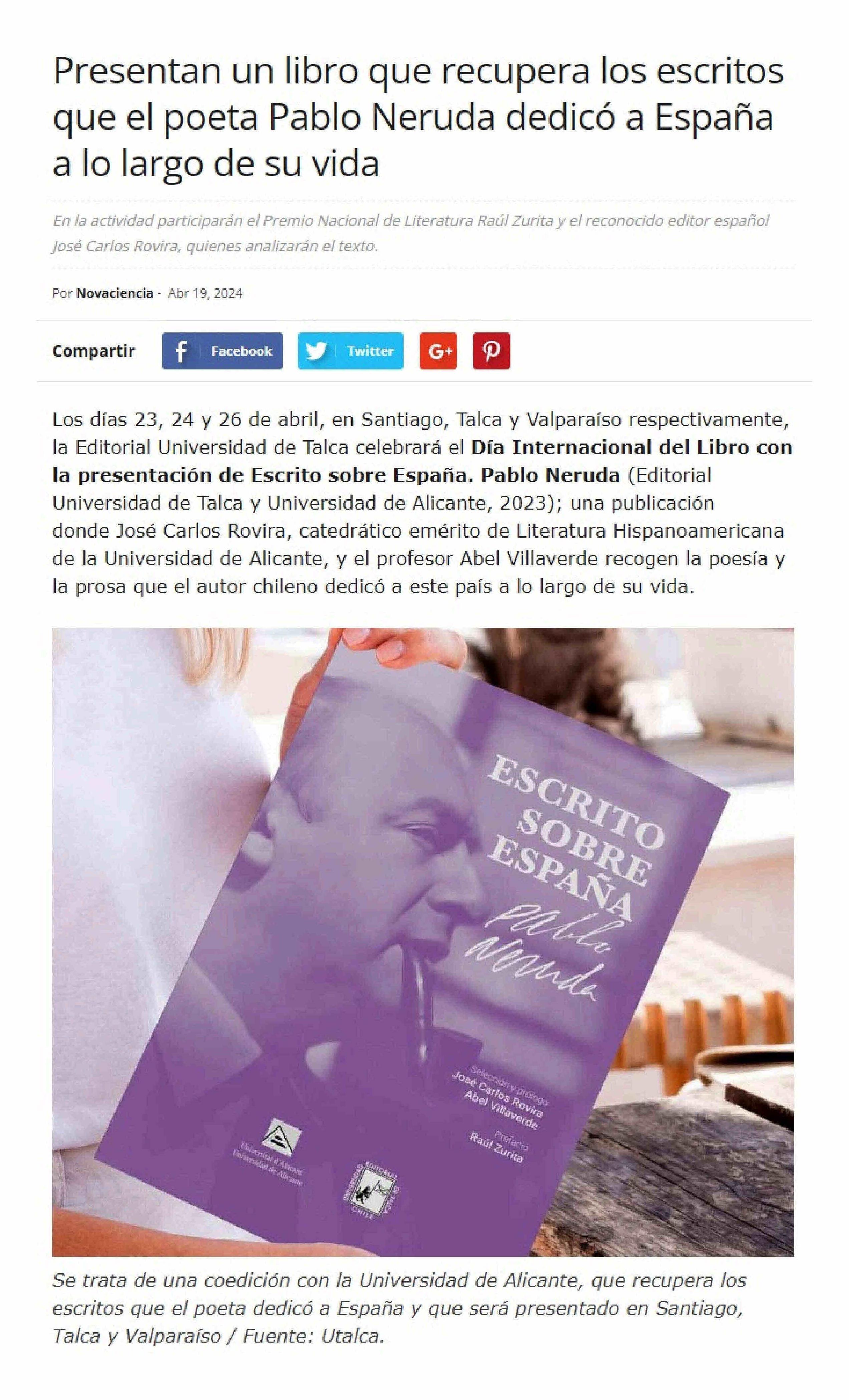 Presentan un libro que recupera los escritos que el poeta Pablo Neruda dedicó a España a lo largo de su vida. Se menciona la Universidad de Talca.
