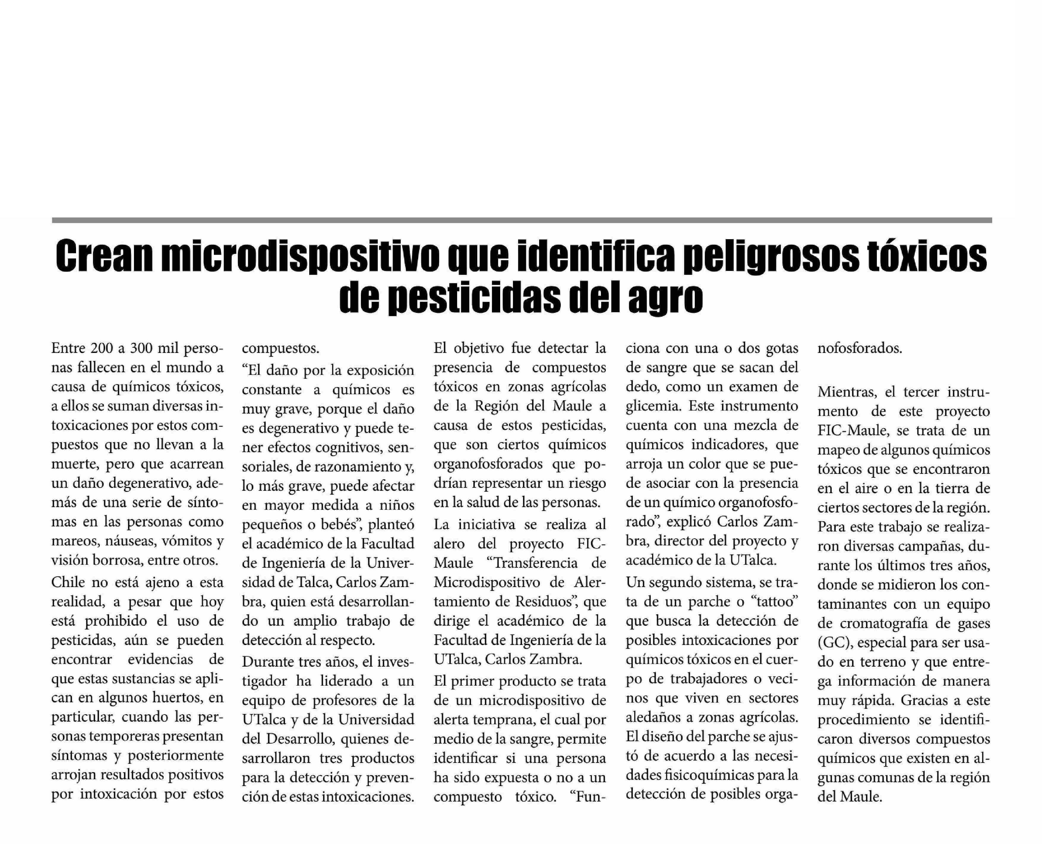 Crean microdispositivo que identifica peligrosos tóxicos de pesticidas del agro. Se refiere Carlos Zambra, académico de la Facultad de Ingeniería.