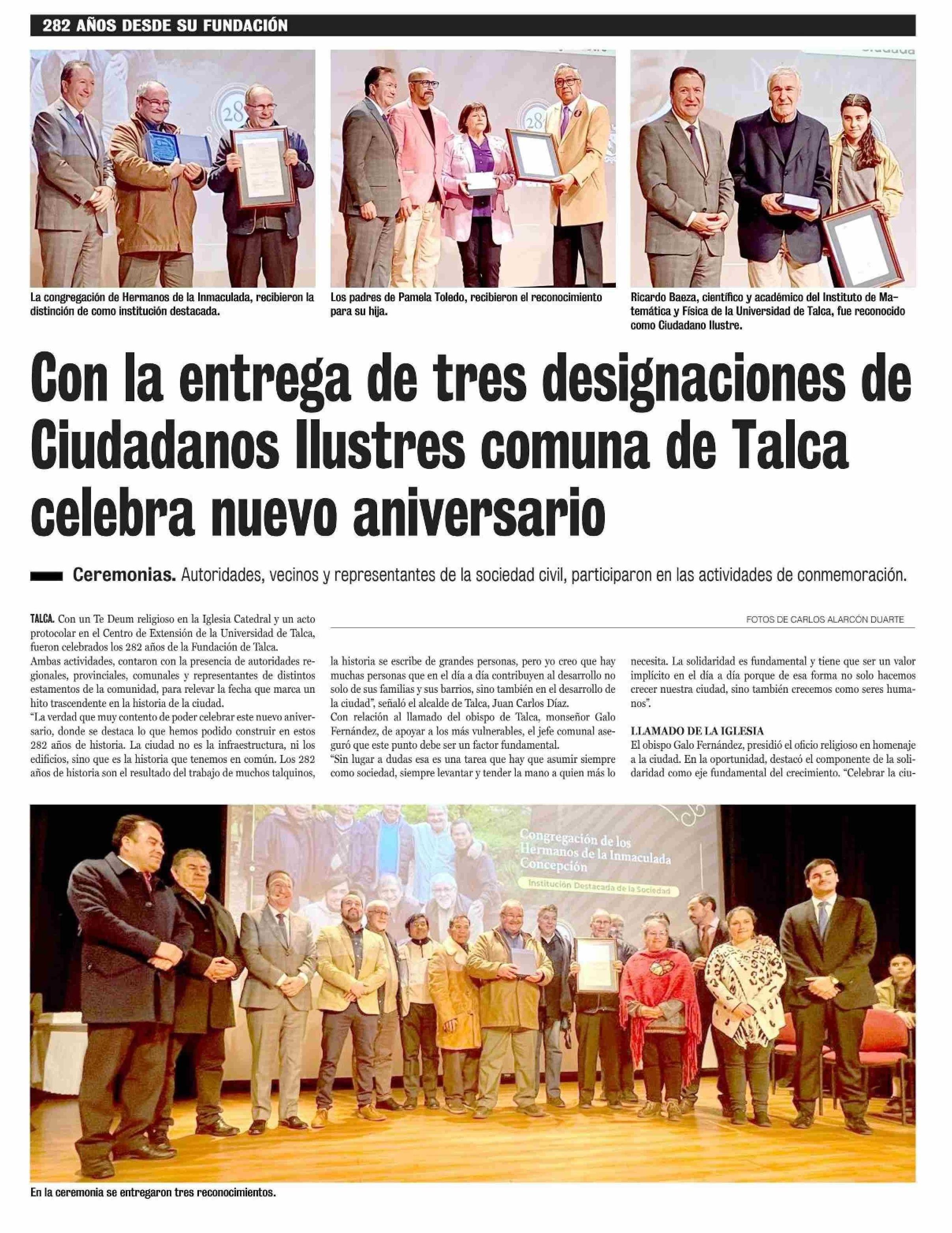 Con la entrega de tres designaciones de Ciudadanos Ilustres comuna de Talca celebra nuevo aniversario. Se menciona la Universidad de Talca.