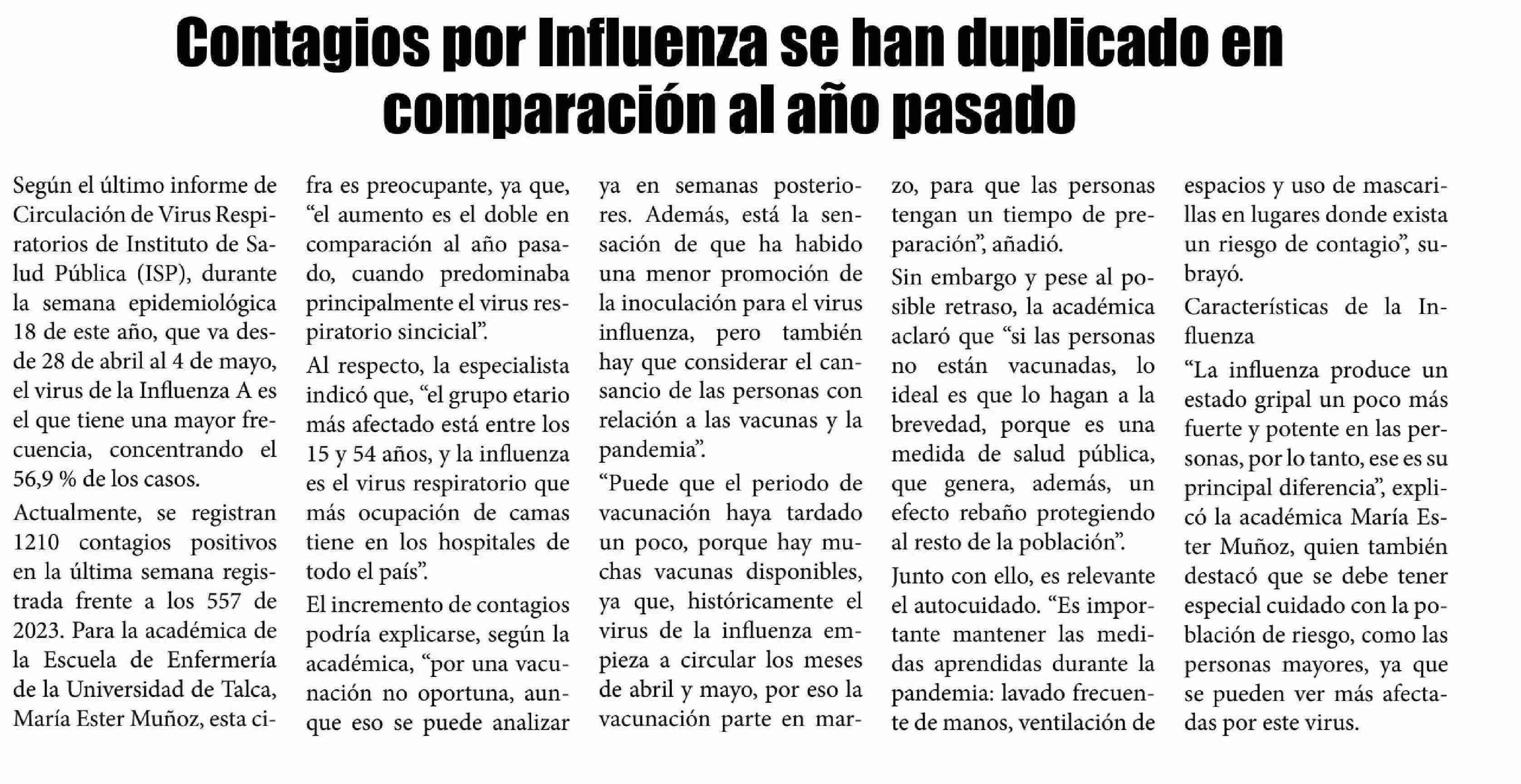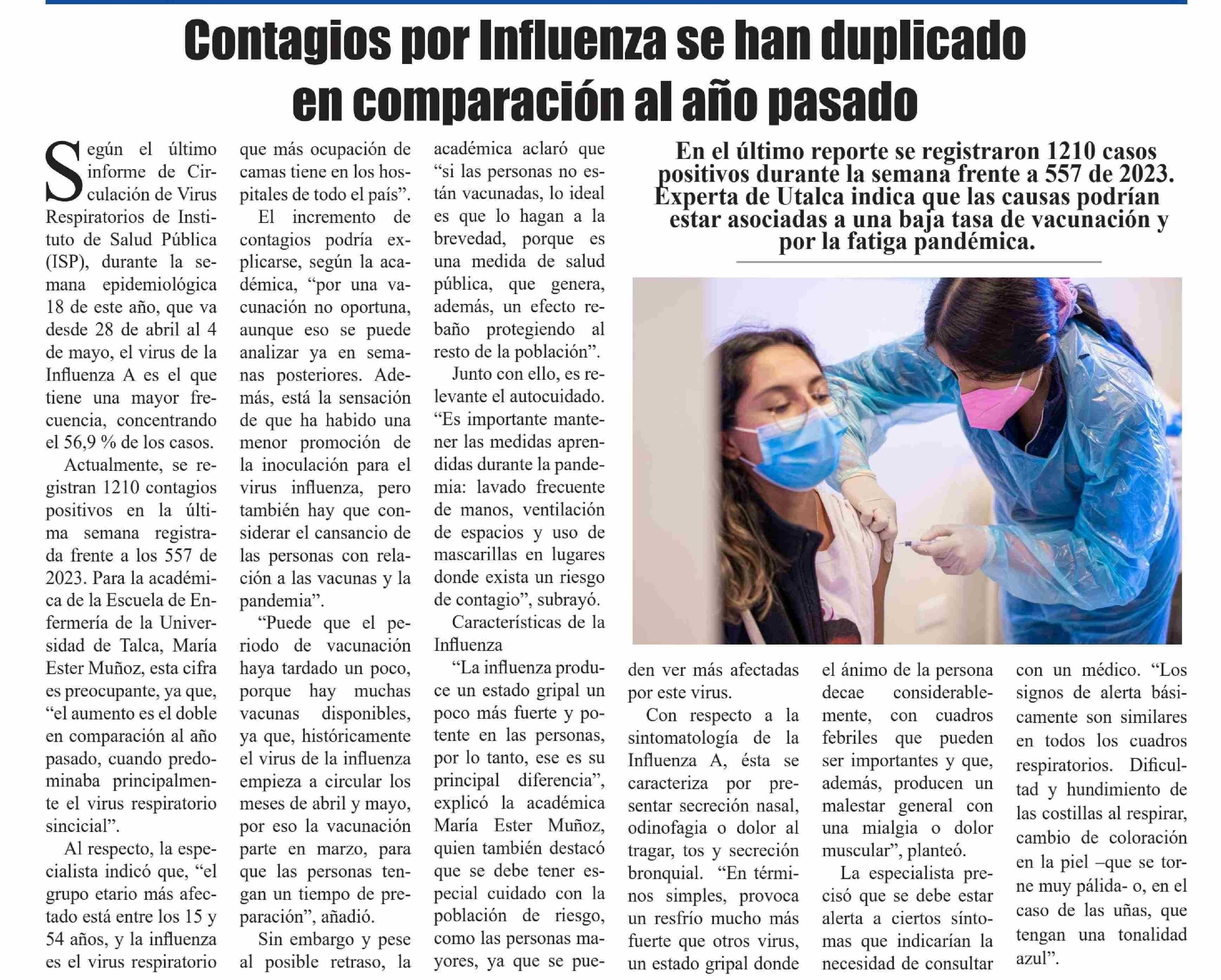 Contagios por influenza se han duplicado en comparación al año pasado. Se refiere María Ester Muñoz, académica de la Escuela de Enfermería.