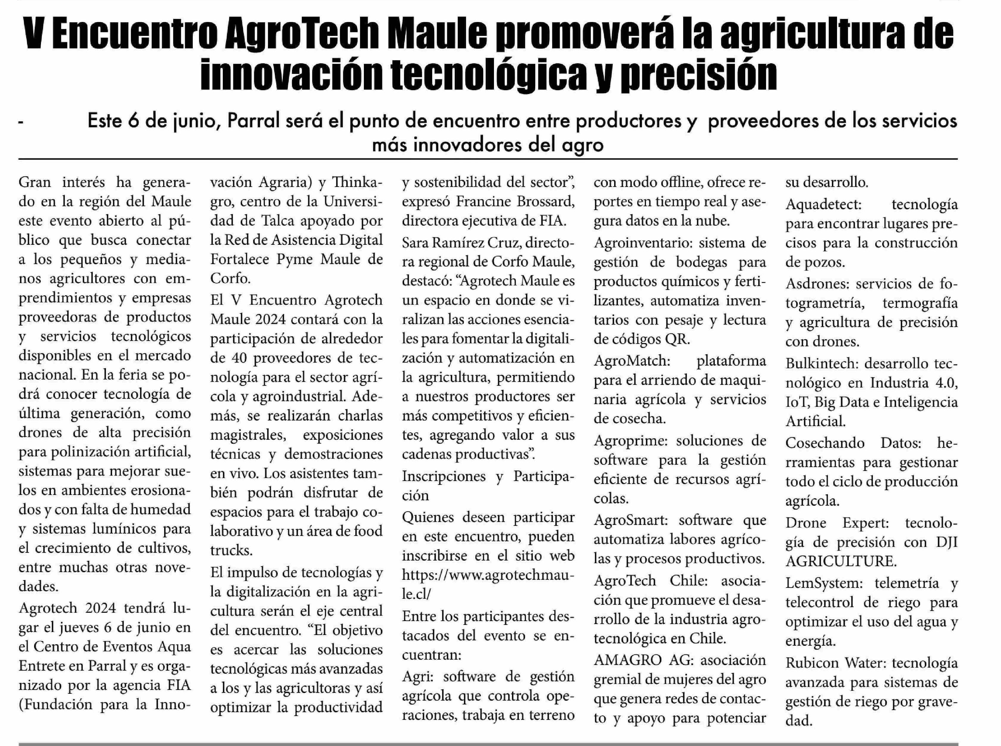 V Encuentro AgroTech Maule promoverá la agricultura de innovación tecnológica y precisión. Se menciona la Universidad de Talca.